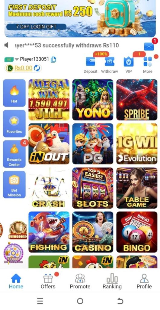 Even on older Android smartphones, the app offers seamless performance thanks to its special optimization for Pakistani users. Players can log in, explore games, collect bonuses, deposit money, withdraw earnings, and take part in seasonal events at this platform, which serves as the main center.
